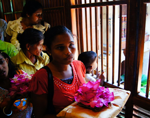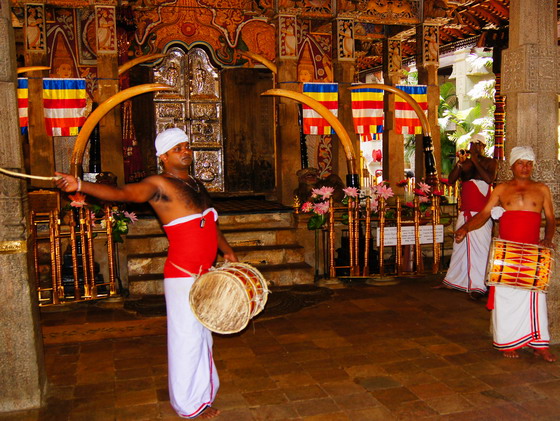 …Начало очередного действа зачинает храмовый оркестр из трех барабанов и пронзительно верещащей трубы – звуки его далеко разносятся по окрестностям и слышны аж на другой стороне Кандийского озера. Квартет из четырех бравых молодцев, с обнаженными торсами, неистовствует на первом этаже Храма, заменяя тут (с успехом!) колокольный звон и крики муэдзинов. Но мало кто из пришедших поклониться кандийской святыне задерживается, дабы насладиться музыкой: паломники устремляются наверх, где в это время открывается дверь в святилище и любой пришедший может пройти мимо и посмотреть…