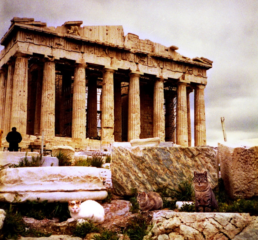 На Акрополе и вокруг него обитает масса очень невозмутимых и независимых кошек и апатичных, равнодушных ко всему собак. Кошки ловят ящериц в многочисленных щелях и трещинах, а собаки молча ждут подачки от туристов.