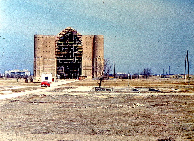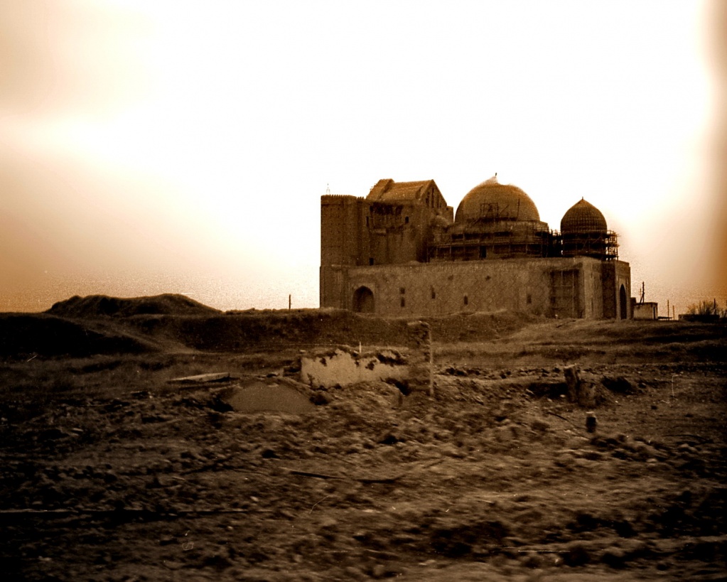 Колоссальное строение, непохожее ни на что другое, в те годы одиноко торчало посередь громадного пустыря, развороченного археологическими раскопками и местными строителями, привычно ковырявшими тут старые кирпичи и глину для выделки самана. Перед грандиозным порталом, обращенным к восходящему солнцу, за пустошью начиналась степь. А сзади, но также на расстоянии, скромно лепились первые многоэтажки Туркестана.