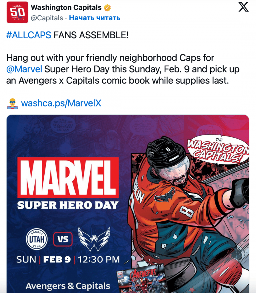 «Проведите время с вашими любимыми на Дне супергероев Marvel в это воскресенье, 9 февраля, и получите комикс», – говорится в посте «Вашингтона» в соцсетях.