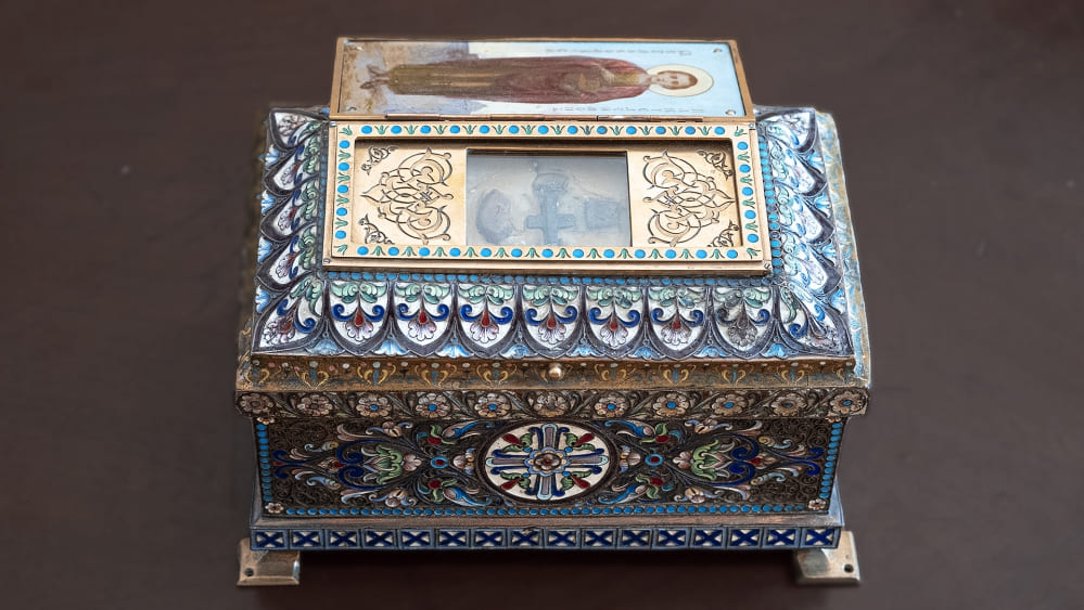 Украшенный эмалями ковчег с честными мощами великомученика Пантелеймона (частью его честной главы) по сей день хранится на престоле Никольского собора Алматы и приносится в утешение верующим в епархии Казахстанского Митрополичьего округа.