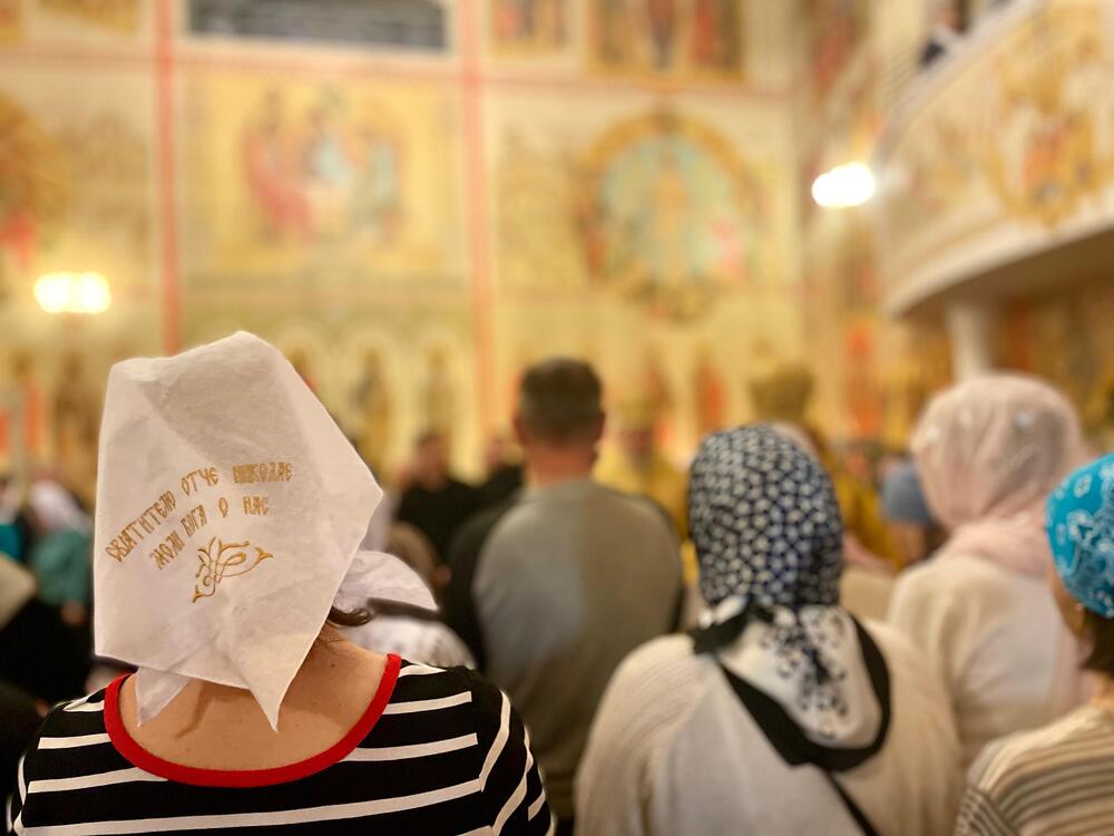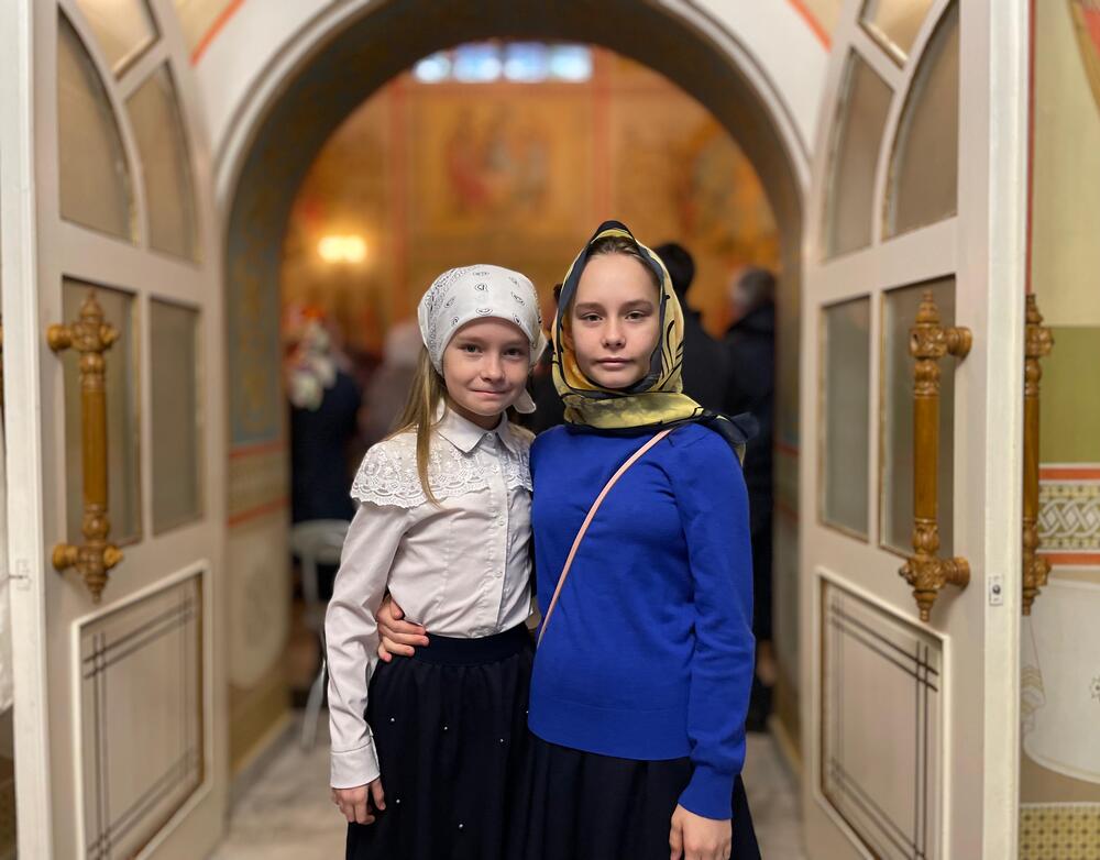 Даша и Сабрина Токаревы делятся своими впечатлениями от литургии: «Сегодня все по-другому: атмосфера удивительная, много батюшек, они читают другие молитвы». Сестры посещают старшую группу Воскресной школы, где изучают христианство, старославянский язык и, как говорит Сабрина, «происхождение всего».
