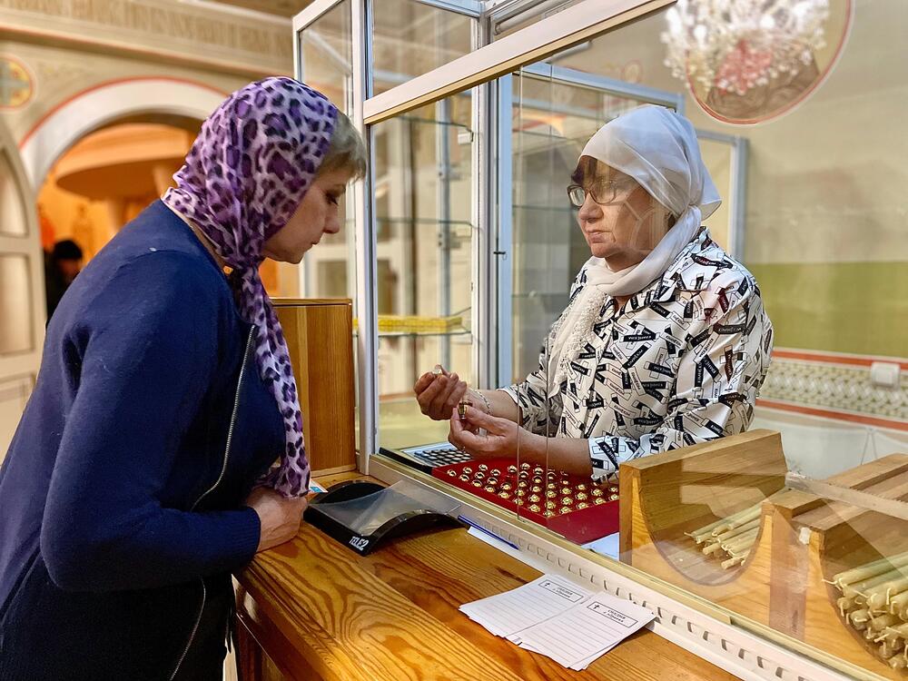 Звуки многоголосого хора разносились не только в молитвенном зале, но и на нижнем этаже, где располагаются кухня, столовая, второй придел храма в честь Матроны Московской и иконная лавка. Хранительница лавки Татьяна Михайловна желает покупателям «теплой молитвы» и с улыбкой рассказывает, что пришла в веру только в 54 года. До этого она была ревностной коммунисткой и долгое время считала, что не заслуживает быть крещеной.