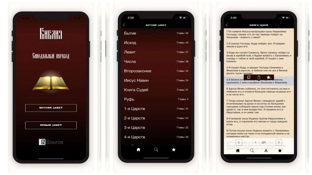Приложение доступно как для IOS, так и для Android. В электронном варианте содержится синодальный перевод Ветхого Завета и Нового Завета на русском языке, предназначенный для домашнего чтения. Так как для богослужения в церкви используется перевод Библии на церковнославянский язык.