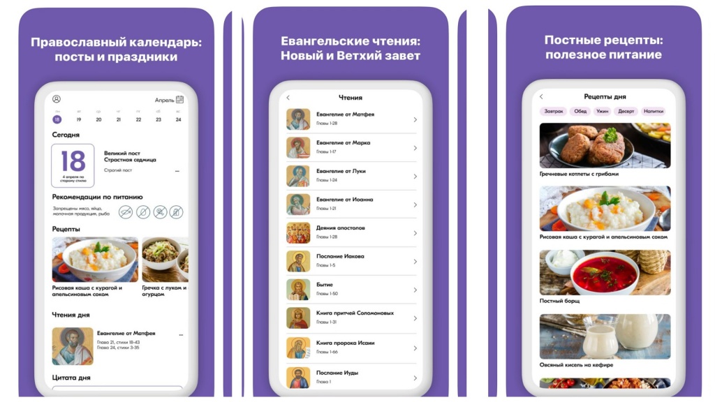 Незаменимый помощник для тех, кто держит пост. В электронном календаре ежедневно отображаются Евангельские чтения, тропари и кондаки, цитаты дня, а также рекомендации по питанию и рецепты для постного завтрака, обеда и ужина.