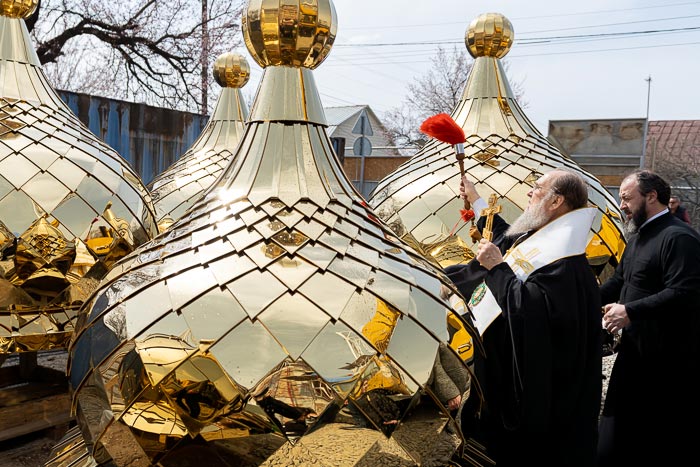 После прочтения молитв на освящение, Глава Митрополичьего округа окропил кресты и купола святой водой.