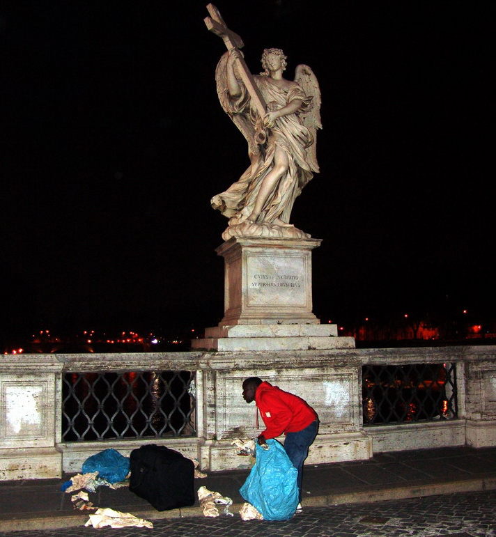 Прохожие (а это сплошь туристы и паломники) интересны для них постольку, поскольку являются носителями кошельков. Негры на мосту Ангела торгуют турецким ширпотребом и сувенирами китайского производства. Вот он где, интернационал в чистом виде!
