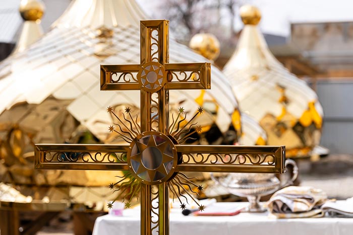 После прочтения молитв на освящение, Глава Митрополичьего округа окропил кресты и купола святой водой.