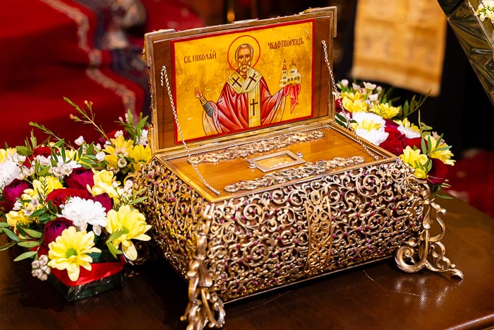 Перед началом богослужения ковчег с мощами святителя и чудотворца Николая, хранящийся в алтаре собора, был изнесен для молитвенного поклонения верующим. Часть мощей Мирликийского святителя – дар Никольскому храму от митрополита Александра. Все участники богослужения получили возможность поклониться этой великой святыне.