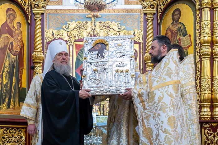 По окончании богослужения Глава Митрополичьего округа передал в дар главному храму Южной столицы для постоянного пребывания и молитвенного поклонения верующих отреставрированную четырехчастную икону с изображением: великомученика Георгия Победоносца, Пророка, Предтечи и Крестителя Господня Иоанна; трех вселенских учителей и святителей Василия Великого, Григория Богослова и Иоанна Златоуста, архистратига Божия Михаила, мучеников Флора и Лавра, священномученика Власия, епископа Севастийского; святителя Модеста Иерусалимского, святителя и чудотворца Николая, архиепископа Мир Ликийских; преподобного Максима Исповедника. Образ украшает старинный серебряный позолоченный оклад, который был пожертвован ктиторами Алматинской епархии.