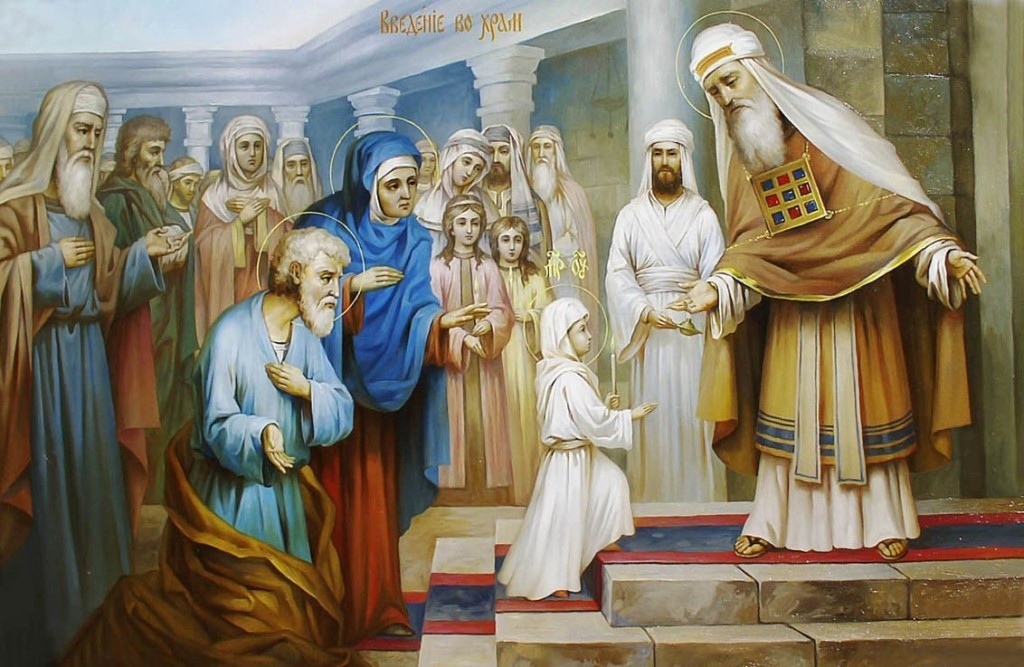 Когда дочке исполнилось три года, родители решили исполнить данное обещание. Они одели ее в красивые одежды, созвали всех родственников и, распевая священные песни и держа в руках зажженные свечи, выдвинулись из Назарета в Иерусалим. Через три дня они пришли к храму, где их встретил первосвященник Захария, будущий отец пророка Иоанна Предтечи.