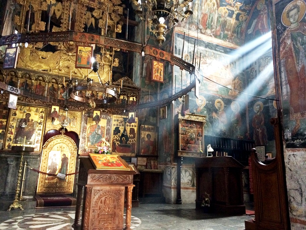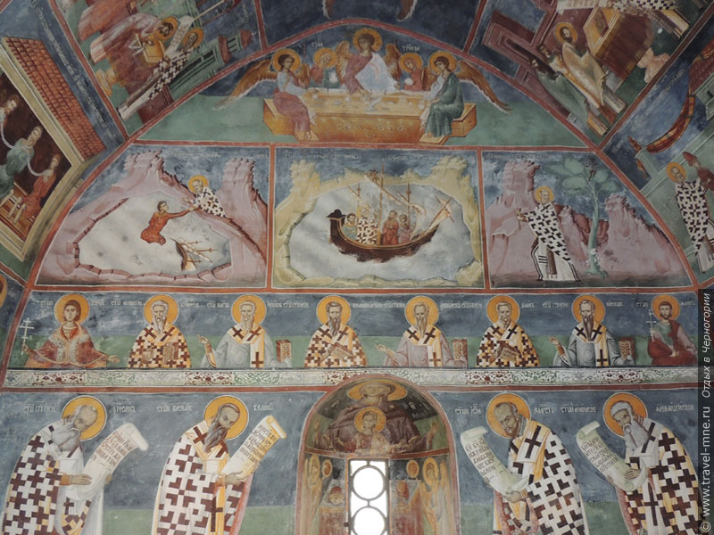 Впервые посещая черногорские храмы, обращаешь внимание на то, что стены храмов покрывают древние сербские настенные фрески византийской школы. Кажется, что эти фрески, в цветах которых преобладают холодные тона (синие, зеленые) сияют какой-то особой внутренней таинственной жизнью. Именно цвета фресок отличают их от традиционной русской росписи, где преобладают красные, зеленые и золотые цвета. От экскурсовода мы узнали, что первоначальное предназначение фресок монастыря Морача – это наглядный урок богословия для тех, кто даже не умел читать.