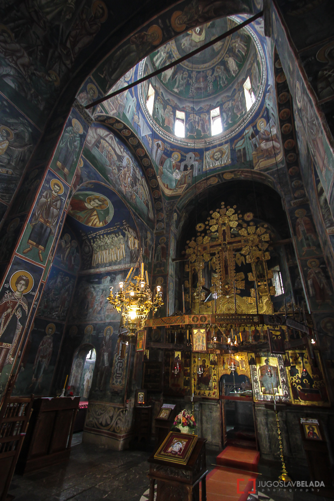 Внутри церкви в центральной части храма находится каменный саркофаг ктитора князя Стефана. Очень красивая двухстворчатая дверь у входа в средний храм украшена слоновой костью. Ею также инкрустированы кресло, стол и трость, которая, согласно преданию, принадлежала Святому Савве. Именно в Успенском соборе сохранились некоторые фрески XIII века. Большинство фресок относится к XVI-XVII векам. Несложно представить, как в те времена эта красота потрясала верующих. На небесно-голубом фоне были изображены Спаситель, Богородица, ветхозаветные и новозаветные святые, что служило свидетельством веры и благочестия всем последующим поколениям христиан.