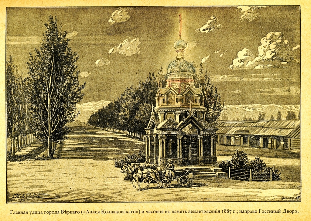 Для увековечения скорби в память еще о землетрясении 1887 года горожанами была поставлена мемориальная часовня, располагавшаяся напротив Гостиного Двора (ныне Зеленый базар), посереди бульвара Колпаковского (Ильича-Ленина, ныне Достык). По воспоминаниям стариков, именно в эту часовню, позже, в 1921 году, свозились для опознания жертвы разрушительного селя. Во время антирелигиозного террора часовню снесли.