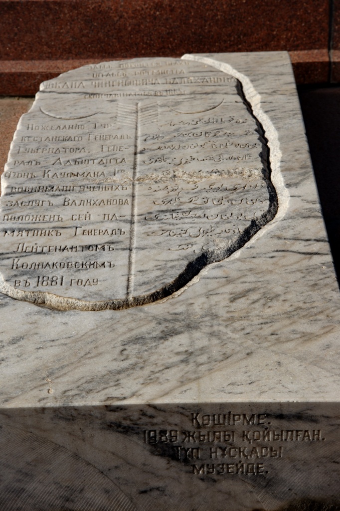Предыдущий, поставленный в 1880 году стараниями легендарного генерала Колпаковского, туркестанского губернатора Кауфмана и радением купца Кузнецова, сохранился в виде мраморной плиты с эпитафией по-русски и по-арабски (копия его вделана у подножия нынешнего памятника, а оригинал со следами варварства можно увидать в музее). А перед этим существовал еще и глиняный мазар, от которого не осталось ничего кроме рисунка друга-однокашника Григория Потанина.