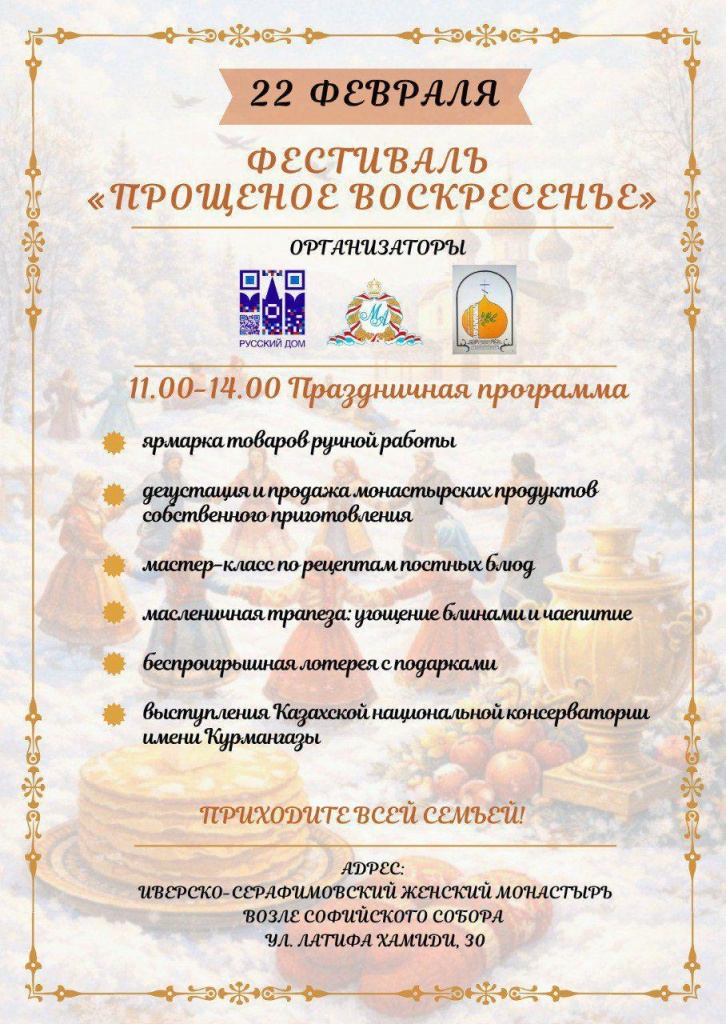 Празднование начнется в 11 часов и продлится до 14 часов. Гостей ждут ярмарка товаров ручной работы, дегустация монастырских блюд, угощение блинами и чаепитие, мастер-класс по приготовлению постных блюд и лотерея с подарками. Также перед гостями выступит коллектив Казахской национальной консерватории имени Курмангазы.