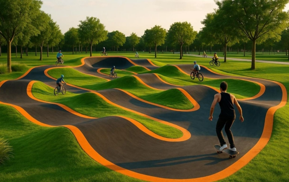 Сейчас на объекте ведутся строительно-монтажные работы, в их числе: устройство памп-трека и скейтпарка, пешеходных и беговых дорожек, а также озеленение территории. Планируется обустройство спортивных и игровых площадок, уличных тренажеров и рекреационных зон. Общая площадь спортивных треков превысит две тысячи квадратных метров, протяженность беговой дорожки составит 1,3 км. Велодорожки прокладываться не будут.