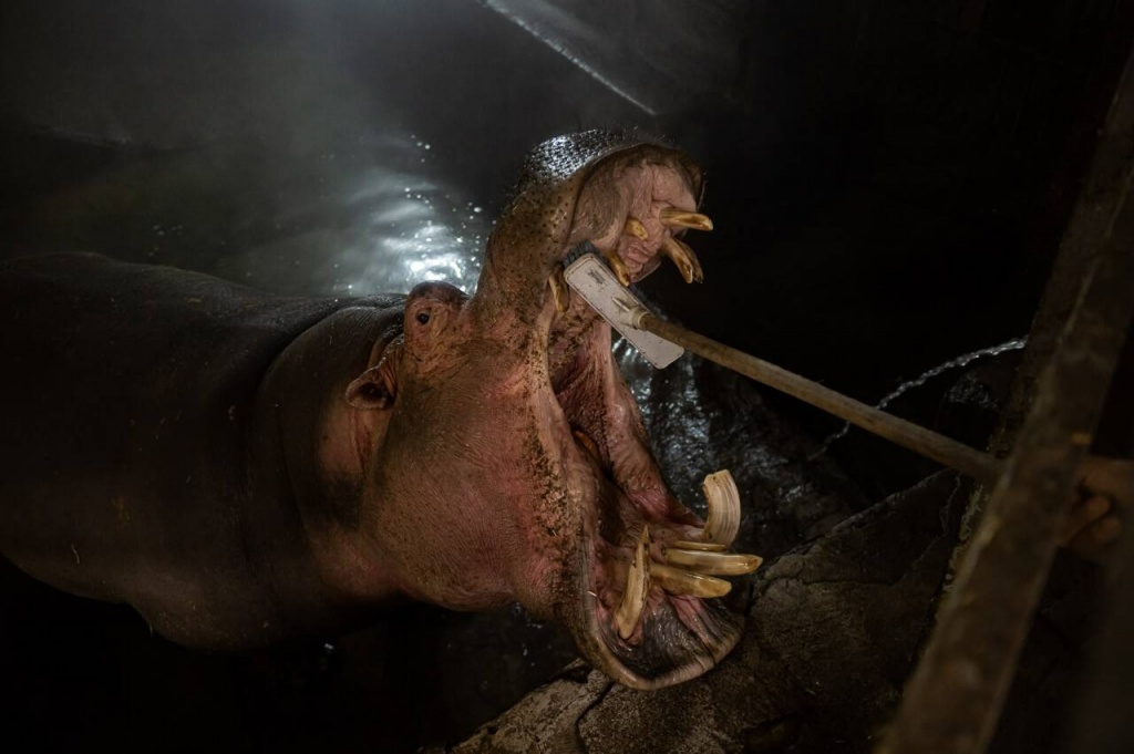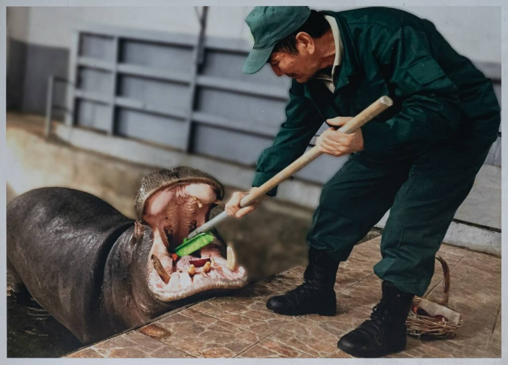 "Джамбо любит чистить зубы, этому его научил предыдущий кипер. Сначала он не открывал рот, потом запомнил команды. Зубы чистим только через ограду бассейна. Зимний рацион у них особо не отличается от летнего: только тем, что зимой немного больше еды даём. Бегемоты травоядные, каждый день по 10 кг сена каждому, яблоки, морковь, свёклу, лук, комбикорм", – сообщил Балабек Махатов.