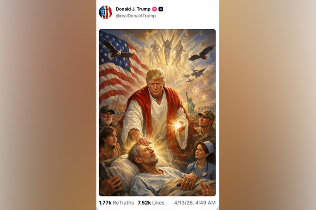 Так, на картинке Трамп был одет в белый хитон и красный гиматий, а из его ладоней шел свет. Одной рукой президент прикасался к лежащему мужчине в больничной рубашке. На изображении президента окружают медсестра, молящаяся женщина, мужчина в кепке с надписью «Ветеран».