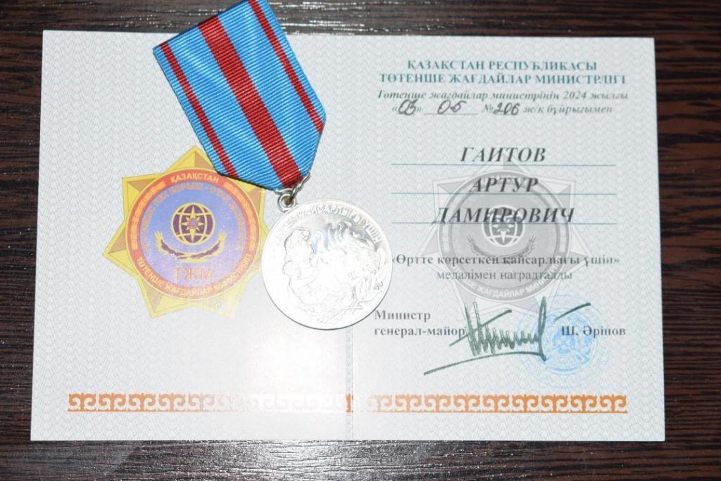 Увидев огонь, он закрыл дверь на кухню, отключил электричество и вылез вместе с братом через окно. За проявленный героизм мальчика наградили медалью «Өртте көрсеткен қайсарлығы үшін».