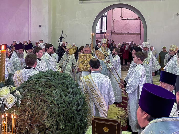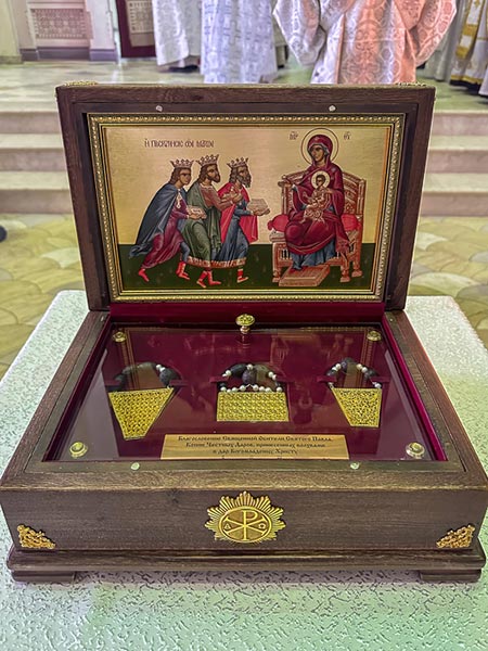 Перед началом богослужения для молитвенного поклонения и духовного укрепления верующих в храм был доставлен ковчег с копией честных Даров волхвов из монастыря святого Павла на горе Афон.