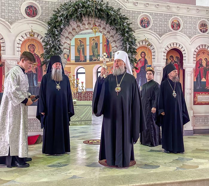В завершение богослужения состоялось славление Рождеству Христову, после которого митрополит Александр поздравил иерархов, духовенство и прихожан с праздником пришествия в мир Бога Слова и торжеством в честь Пресвятой Богородицы, и обратился к собравшимся с проповедью.