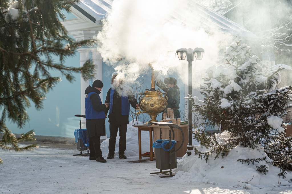 С самого утра к источнику с освященной водой выстроилась очередь. Греясь в лучах солнца, люди неустанно поздравляли друг друга с праздником. Всех желающих бесплатно угощали горячим чаем.